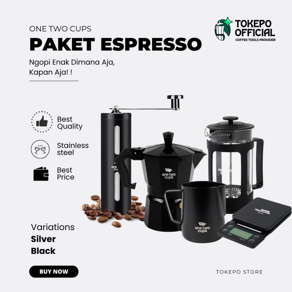 Enggak perlu mesin kopi yang heboh. Tahu enggak kalau kamu bisa bikin kopi di rumah dengan paket bikin kopi lengkap seharga Rp354 ribu? Bahkan kamu sudah bisa bikin espresso nikmat dengan ukuran yang pas.